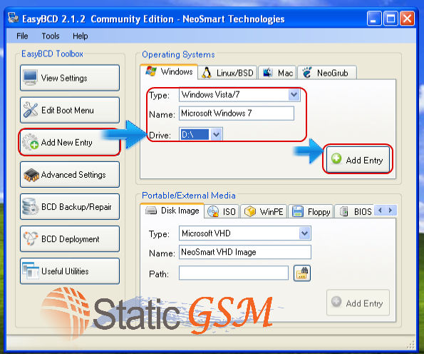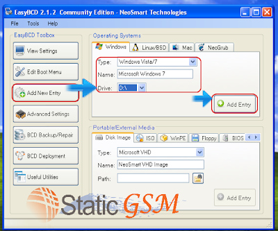Now Click on "Add New Entry" n Select drive where Windows 7 OR 8 is installed & click on "Add Entry"